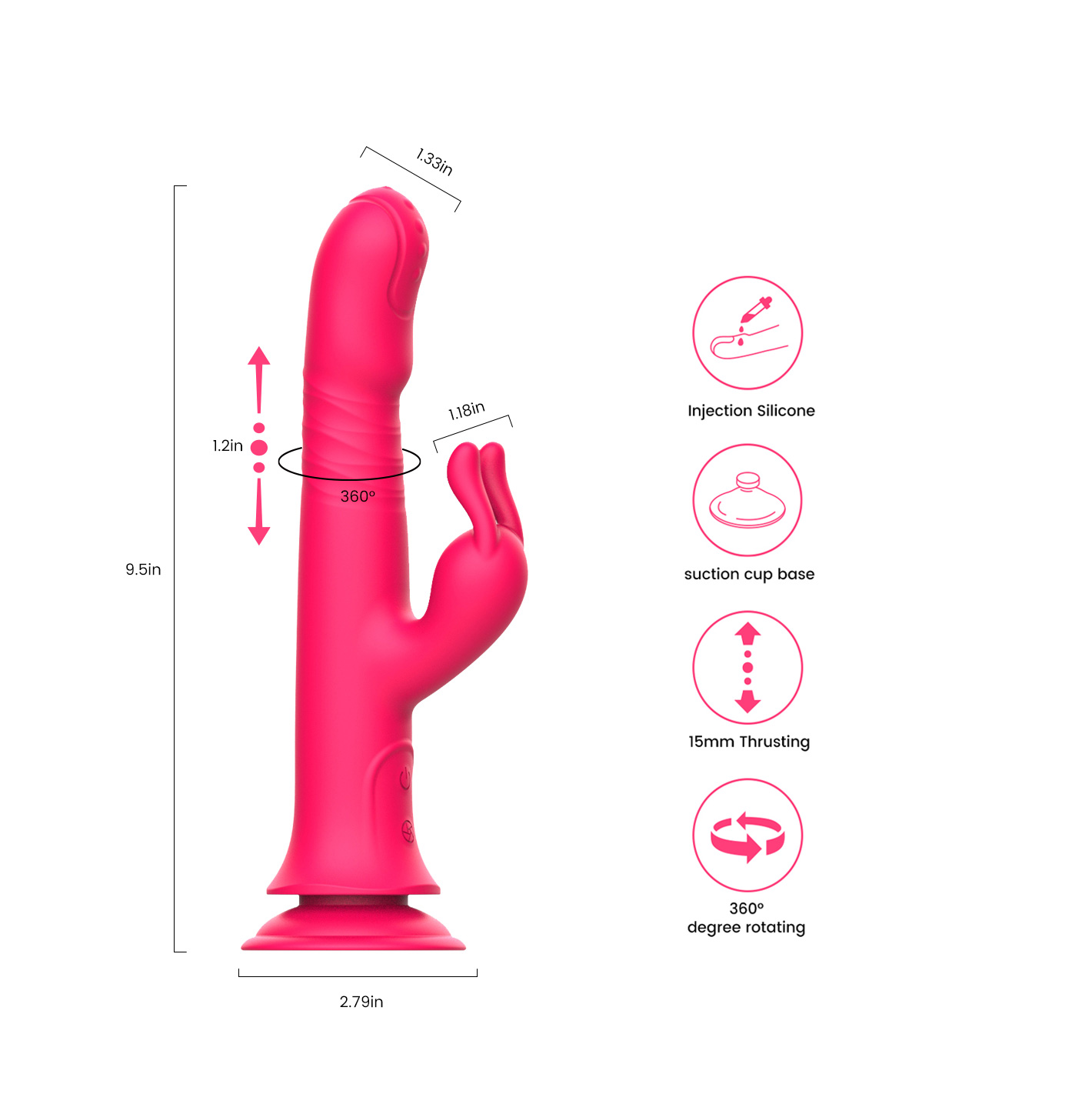 Powered by a powerful motor, while the rabbit vibrator stimulates the C-spot, the thrusting massage head with raised particles increases the range of hot spots and intensity of the massage with the rapidly oscillating head.